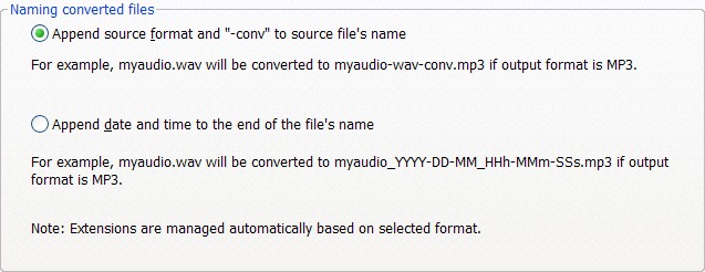 Selecting Export File Naming StrategyObviously, you do not want to specify a file name for each file to be converted manually, resulting in poor user experience. This is also not practical when batch conversion is desired. Huelix Audio Converter offers two ways to name exported files - both derived from the source file's name.